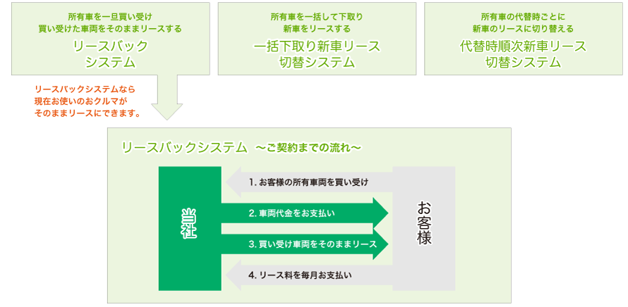 導入方法もいろいろあります。例えばリースバックシステムの場合、現在お使いの所有車を一括してリースに切り替えることができます。
