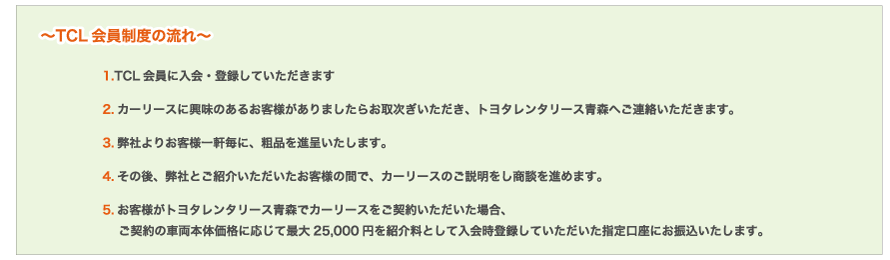 TCL会員に入会・登録していただき、カーリースのお客様をご紹介いただくと、粗品進呈。